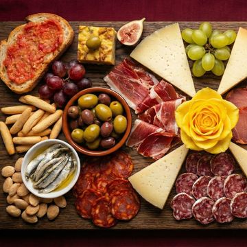 A vibrant Iberian spread featuring jamón, Manchego, marinated olives, pan con tomate, and bold, shareable bites.